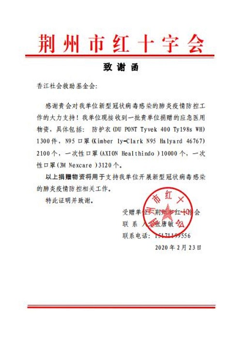 本次援助荊州抗疫醫療物資包括1300件醫用防護服、2100個N95口罩、3120個3M口罩、10000個一次性醫用口罩,該批物資也成為香江社會救助基金會抗疫期間捐贈的第四批醫療物資。